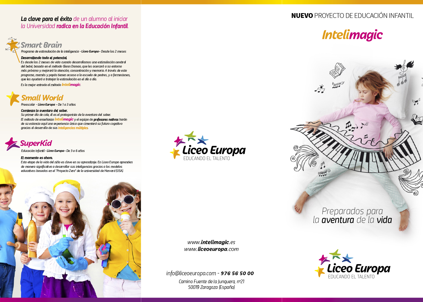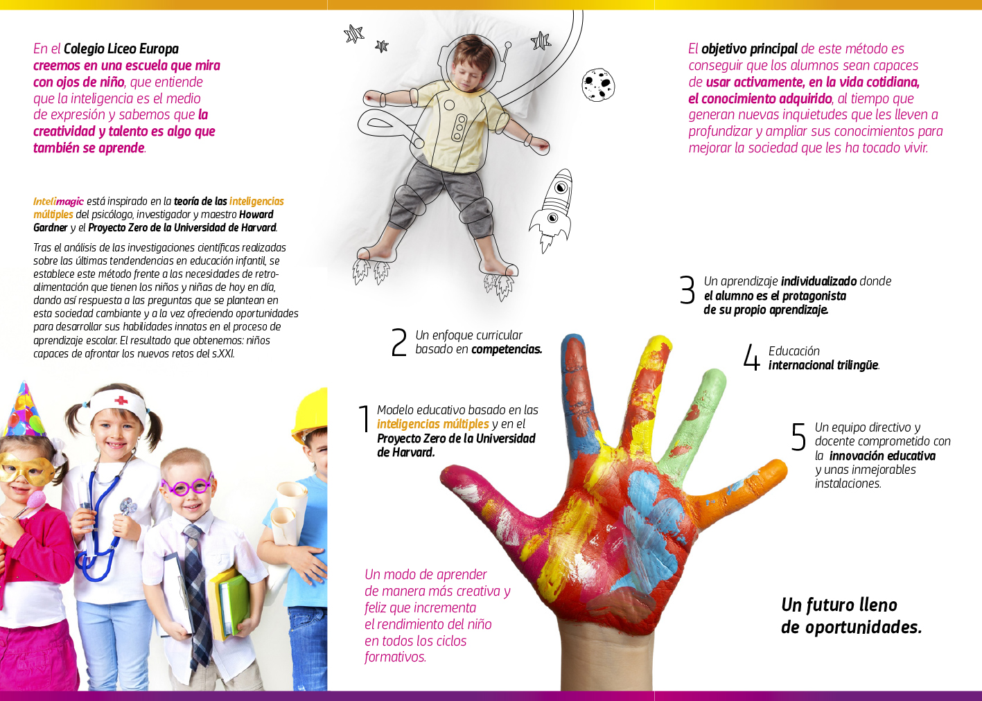 Proyecto de transformación de marca para Liceo Europa, desarrollado para la agencia Impacta Comunicación, con el objetivo de actualizar su identidad y acompañar el lanzamiento de Intelimagic, un nuevo modelo educativo para Infantil basado en inteligencias múltiples, creatividad, aprendizaje individualizado e innovación pedagógica.