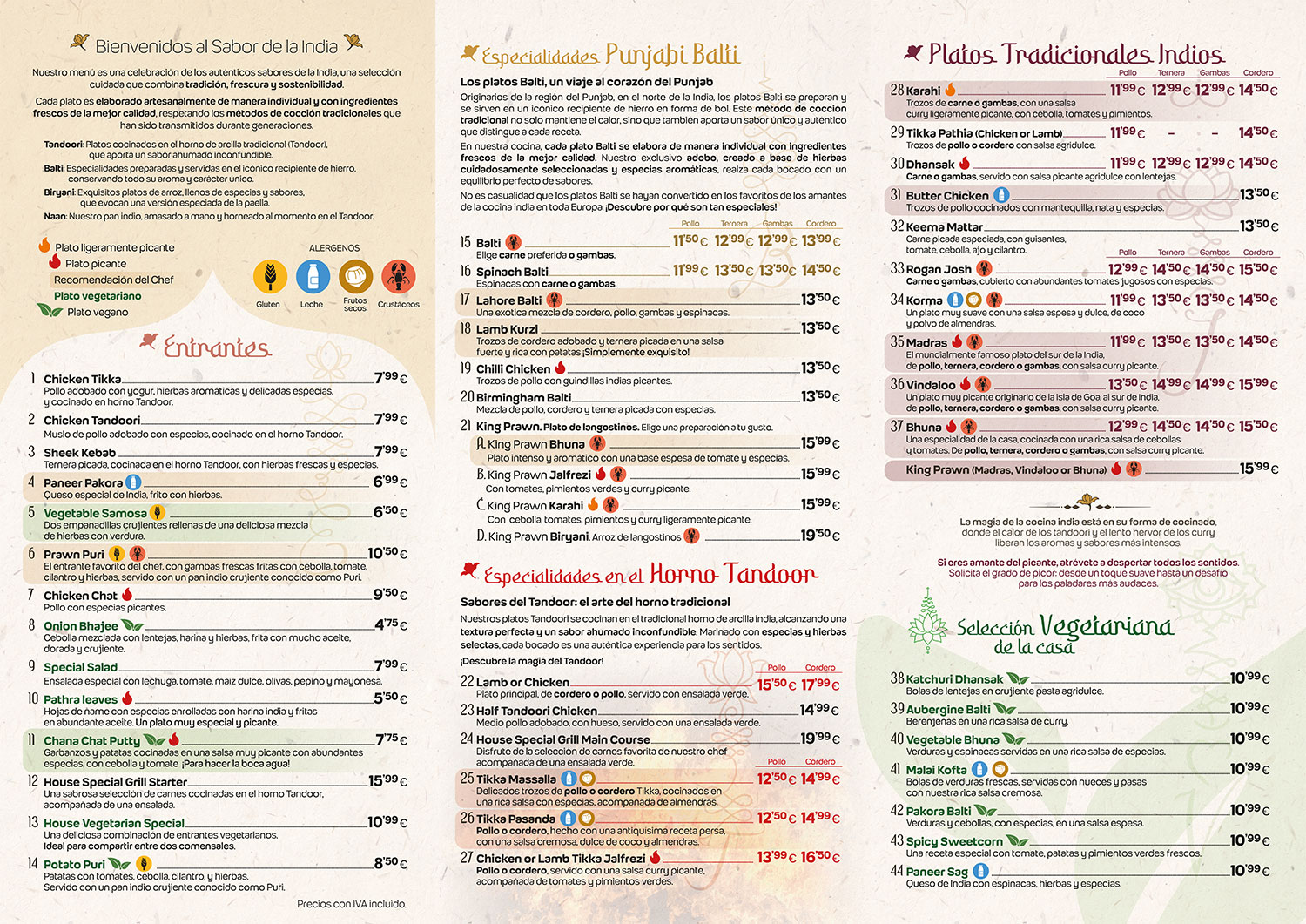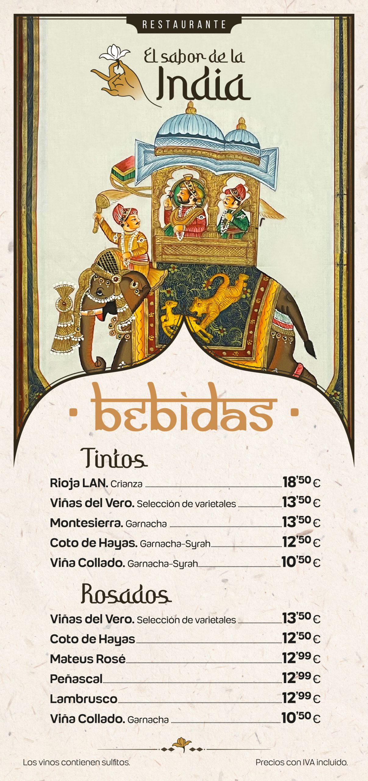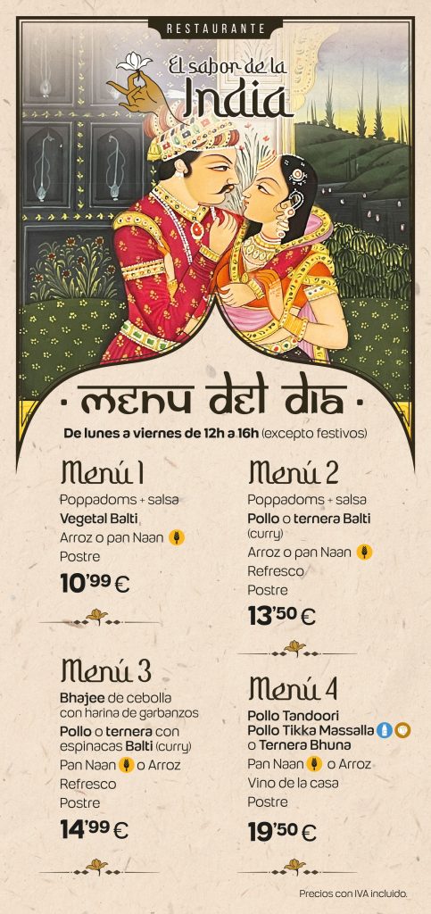 Proyecto de rediseño editorial para El sabor de la India, un restaurante hindú de Zaragoza con larga trayectoria, que necesitaba actualizar sus cartas para hacerlas más claras, seductoras y coherentes con la riqueza de su propuesta gastronómica. El objetivo no era solo ordenar la información, sino también contribuir a un nuevo posicionamiento desde el diseño, reforzando la personalidad del establecimiento y mejorando la percepción de marca en sala y en take away.