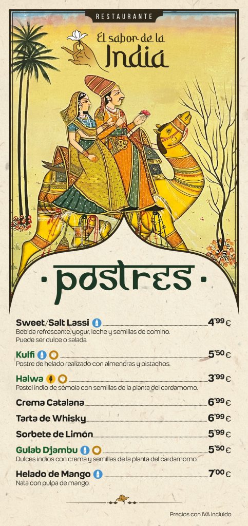La propuesta visual se construyó a partir de una estética inspirada en el imaginario gráfico de la India tradicional, incorporando ilustraciones, ornamentos, cromatismos cálidos y tipografías con carácter, pero cuidando al mismo tiempo la legibilidad y la jerarquía de contenidos. Se trabajó el conjunto completo de soportes —tríptico principal, bebidas, postres y menú del día— para unificar la experiencia visual y facilitar la lectura de una oferta amplia y diversa.