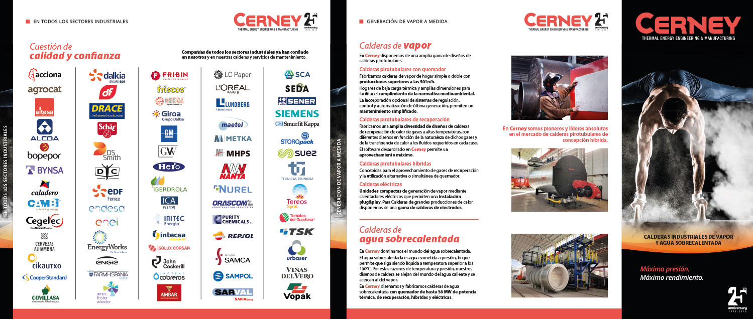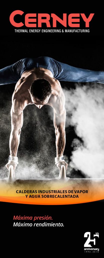 Diseño de un folleto corporativo para Cerney construido desde una idea creativa potente: asociar la exigencia técnica de sus calderas industriales con la tensión, el control y el rendimiento de un gimnasta de élite. Bajo el claim “Máxima presión. Máximo rendimiento”, la pieza convierte una propuesta industrial compleja en una comunicación más emocional, visual y diferenciadora, capaz de reforzar el posicionamiento de la marca como especialista en soluciones de vapor y agua sobrecalentada a medida.