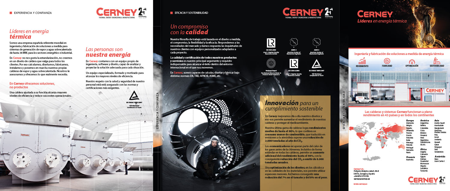 Trabajo realizado para la Agencia BrandInBlack. El resultado es un soporte editorial con alta capacidad de impacto, que combina narrativa visual, jerarquía informativa y diseño funcional para presentar a Cerney como una empresa de ingeniería térmica, orientada a la eficacia, la fiabilidad, la optimización y la sostenibilidad.