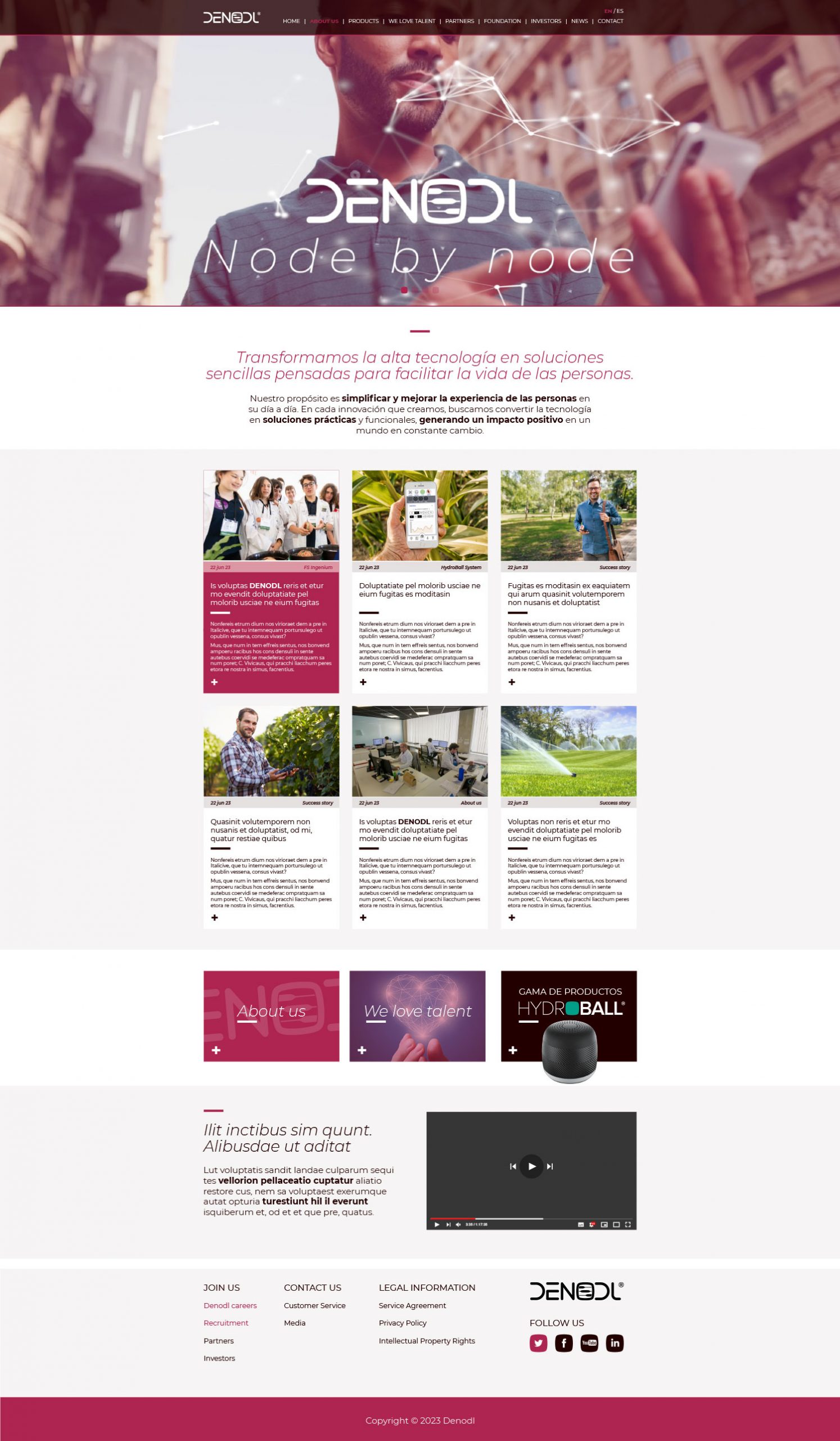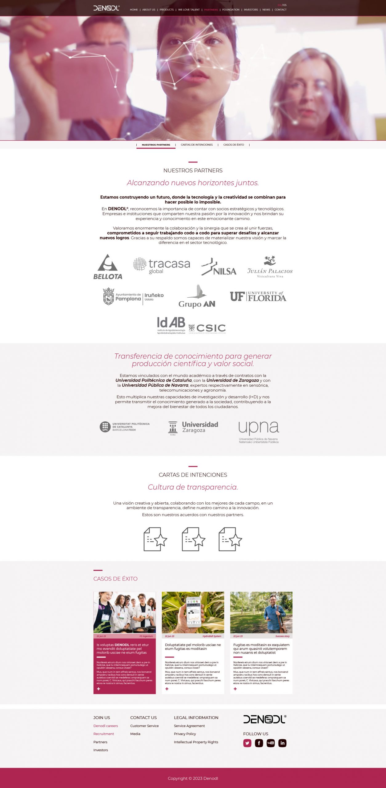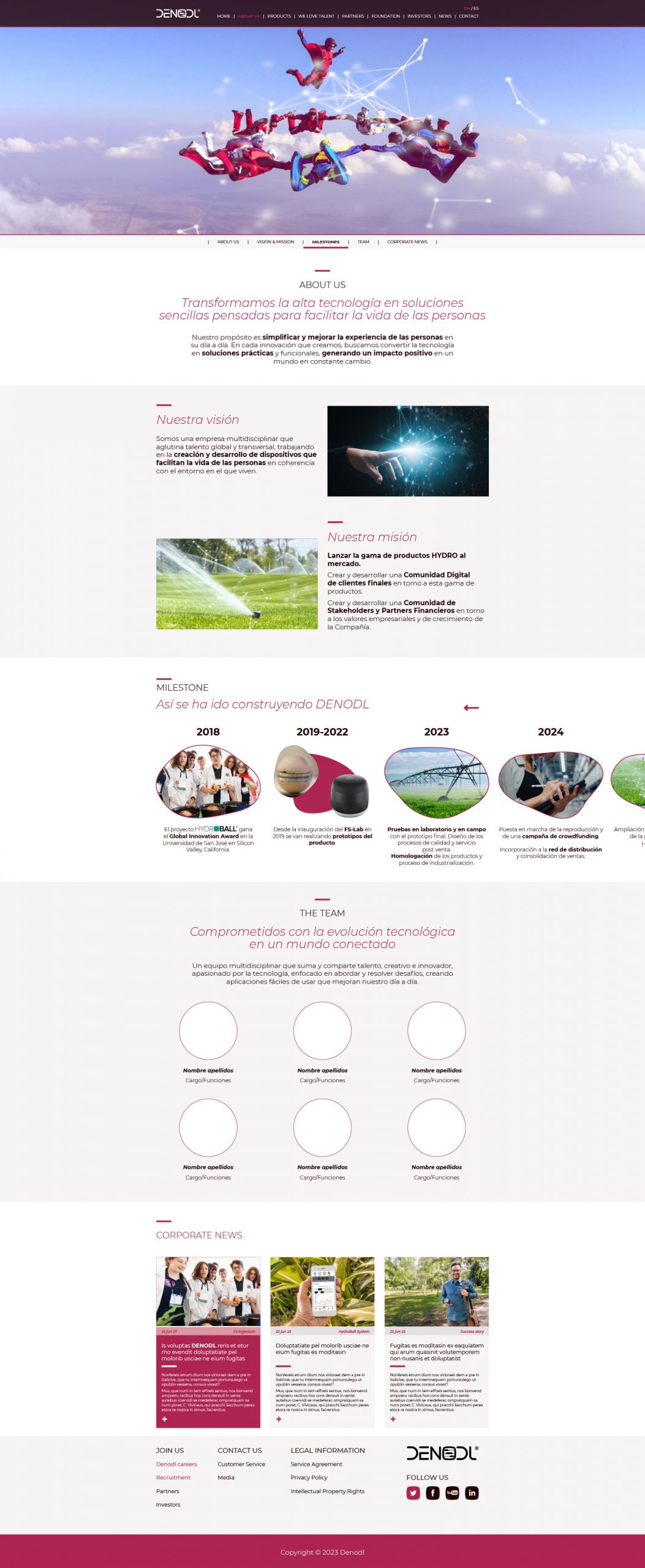 A partir de esa base se diseñó la presencia digital de la marca, estructurando una web capaz de explicar su visión, su misión, su ecosistema de productos, su red de partners, su dimensión fundacional y su oportunidad de crecimiento. La web se planteó como una plataforma para ordenar el relato corporativo de Denodl y presentar de forma clara una empresa multidisciplinar, conectada con la innovación, la investigación aplicada y el desarrollo de soluciones IoT.